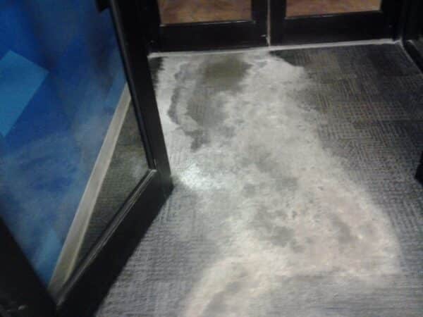 Most ice melts used around the outside of facilities are in the form of a dried, hard material that is distributed (often way too heavy) on the driveways, parking lots and sidewalks. When they come in contact with moisture (snow and ice) they will begin to dissolve into a liquid (brine), creating a chemical reaction interrupting the liquid’s ability to form ice crystals. As this liquid is moved throughout the building and is deposited, it starts to dry, turning back to its original state of a solid. The typical water rinse extraction often isn’t enough for heavy salt buildup because the salt can re-crystallize as the carpet dries.